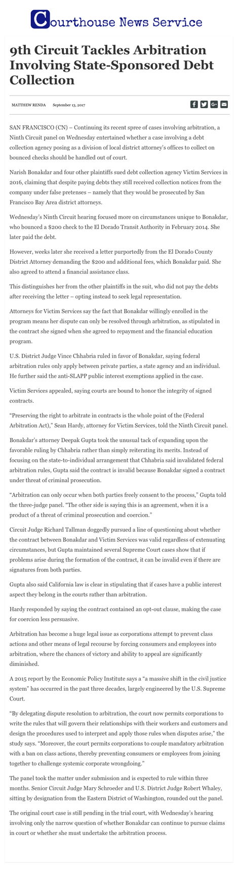 Narish Bonakdar and four other plaintiffs sued debt collection agency Victim Services in 2016, claiming that despite paying debts they still received collection notices from the company under false pretenses – namely that they would be prosecuted by San Francisco Bay Area district attorneys.