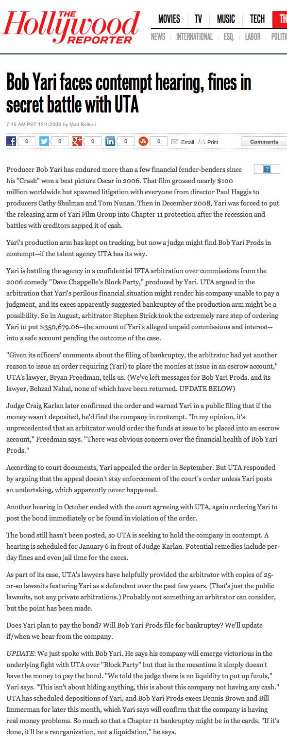 Yari is battling the agency in a confidential IFTA arbitration over commissions from the 2006 comedy “Dave Chappelle’s Block Party,” produced by Yari. UTA argued in the arbitration that Yari’s perilous financial situation might render his company unable to pay a judgment, and its execs apparently suggested bankruptcy of the production arm might be a possibility. So in August, arbitrator Stephen Strick took the extremely rare step of ordering Yari to put $350,679.06–the amount of Yari’s alleged unpaid commissions and interest–into a safe account pending the outcome of the case.