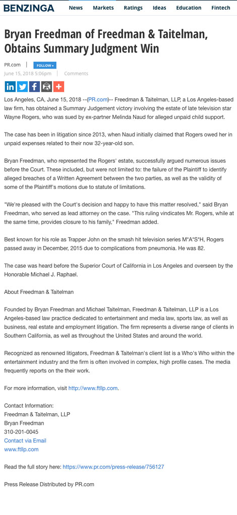 Los Angeles, CA, June 15, 2018 –(PR.com)– Freedman & Taitelman, LLP, a Los Angeles-based law firm, has obtained a Summary Judgement victory involving the estate of late television star Wayne Rogers, who was sued by ex-partner Melinda Naud for alleged unpaid child support.