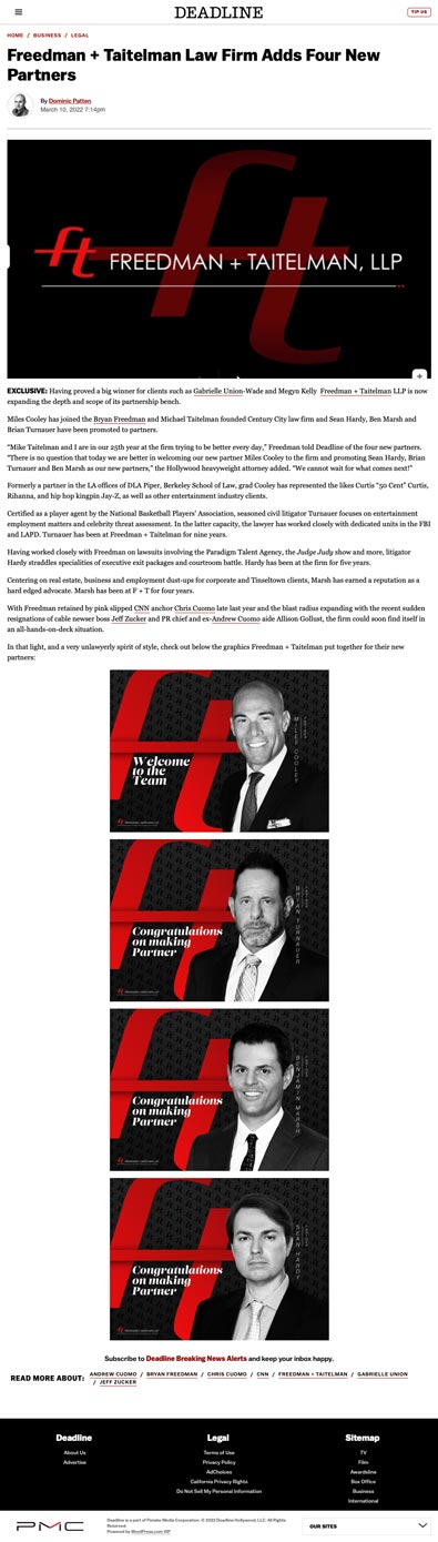 “Mike Taitelman and I are in our 25th year at the firm trying to be better every day,” Freedman told Deadline of the four new partners. “There is no question that today we are better in welcoming our new partner Miles Cooley to the firm and promoting Sean Hardy, Brian Turnauer and Ben Marsh as our new partners,” the Hollywood heavyweight attorney added. “We cannot wait for what comes next!”
