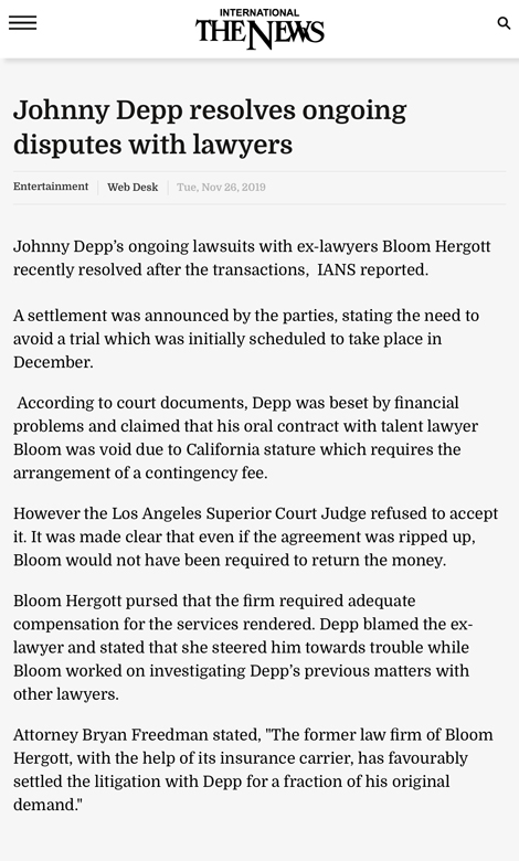 The former law firm of Bloom Hergott, with the help of its insurance carrier, has favorably settled the litigation with Depp for a fraction of his original demand.