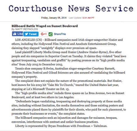 LOS ANGELES (CN) – Billboard companies sued Irish singer-songwriter Hozier and others, including the Hollywood Film Festival and Anschutz Entertainment Group, claiming they slapped “unsightly” displays over premium ad space.