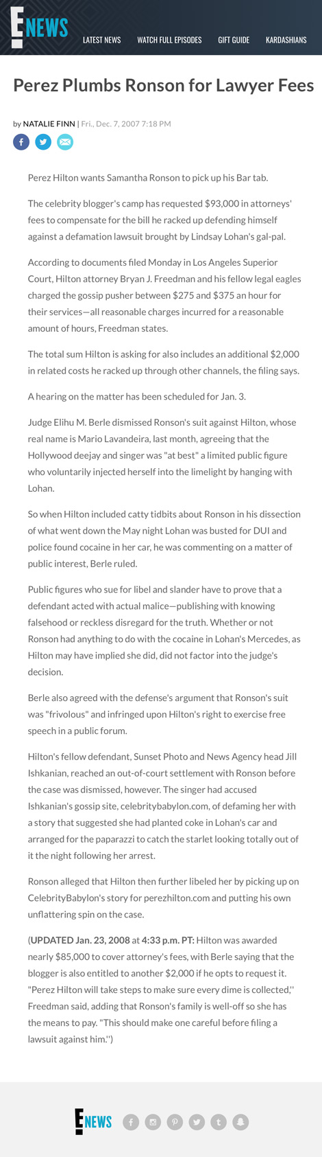 So when Hilton included catty tidbits about Ronson in his dissection of what went down the May night Lohan was busted for DUI and police found cocaine in her car, he was commenting on a matter of public interest, Berle ruled.