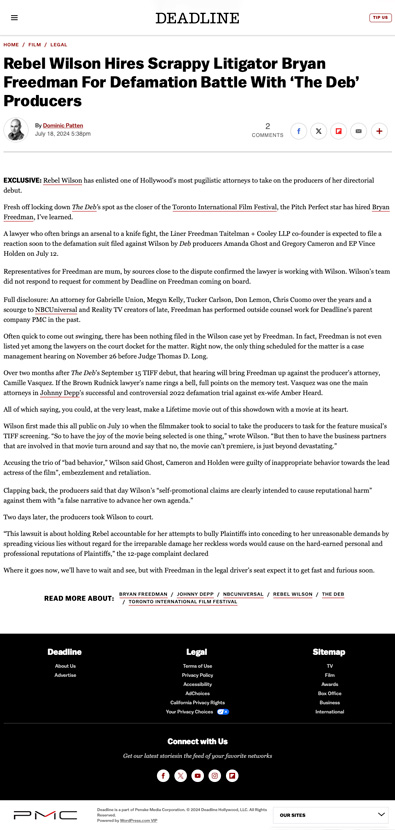 Representatives for Freedman are mum, by sources close to the dispute confirmed the lawyer is working with Wilson. Wilson’s team did not respond to request for comment by Deadline on Freedman coming on board.