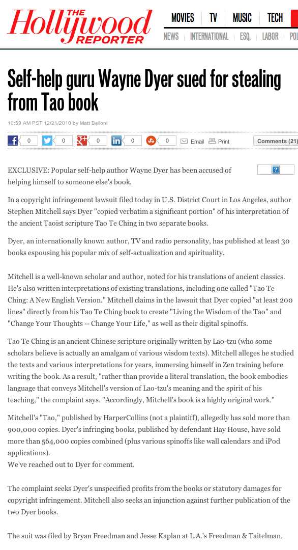 Mitchell is a well-known scholar and author, noted for his translations of ancient classics. He’s also written interpretations of existing translations, including one called “Tao Te Ching: A New English Version.” Mitchell claims in the lawsuit that Dyer copied “at least 200 lines” directly from his Tao Te Ching book to create “Living the Wisdom of the Tao” and “Change Your Thoughts — Change Your Life,” as well as their digital spinoffs.