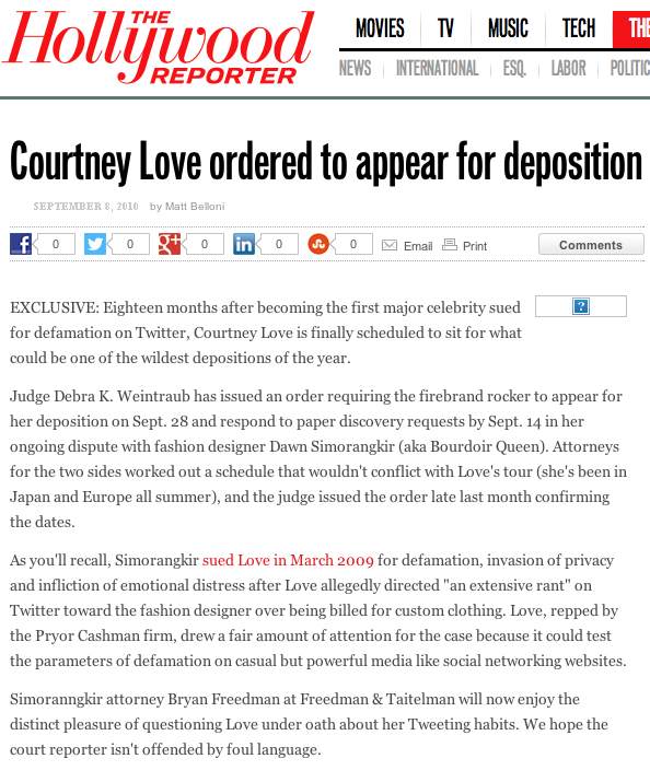 Simoranngkir attorney Bryan Freedman at Freedman & Taitelman will now enjoy the distinct pleasure of questioning Love under oath about her Tweeting habits. We hope the court reporter isn’t offended by foul language.