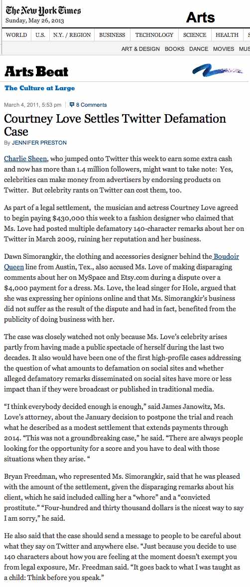 The case was closely watched not only because Ms. Love’s celebrity arises partly from having made a public spectacle of herself during the last two decades. It also would have been one of the first high-profile cases addressing the question of what amounts to defamation on social sites and whether alleged defamatory remarks disseminated on social sites have more or less impact than if they were broadcast or published in traditional media.