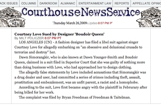 LOS ANGELES (CN) – A fashion designer has filed a libel suit against singer Courtney Love for allegedly embarking on “an obsessive and delusional crusade to terrorize and destroy” her.