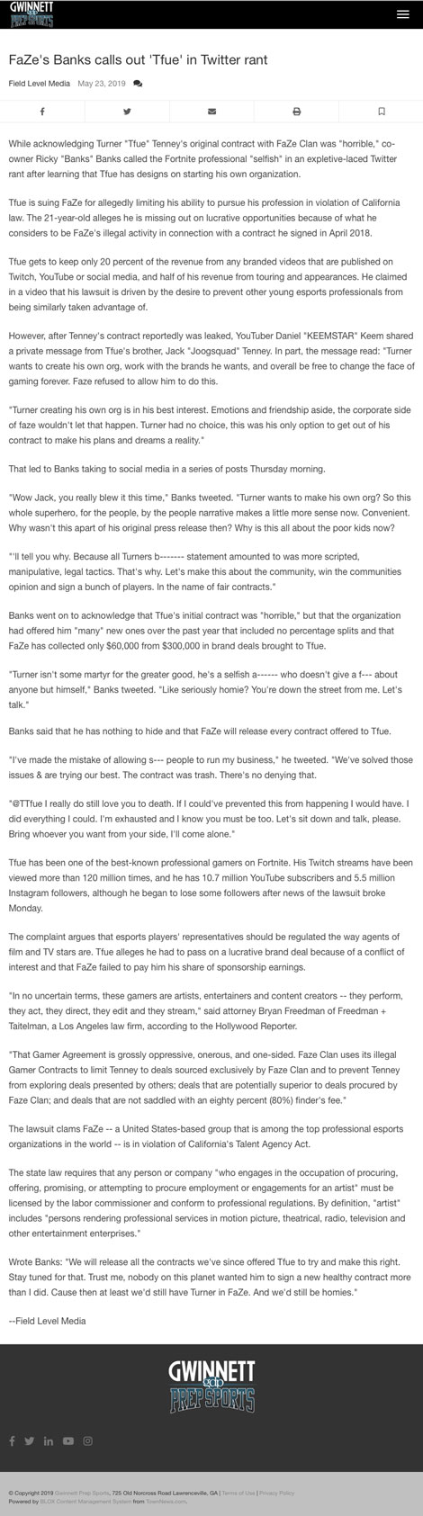 Banks went on to acknowledge that Tfue’s initial contract was “horrible,” but that the organization had offered him “many” new ones over the past year that included no percentage splits and that FaZe has collected only $60,000 from $300,000 in brand deals brought to Tfue.