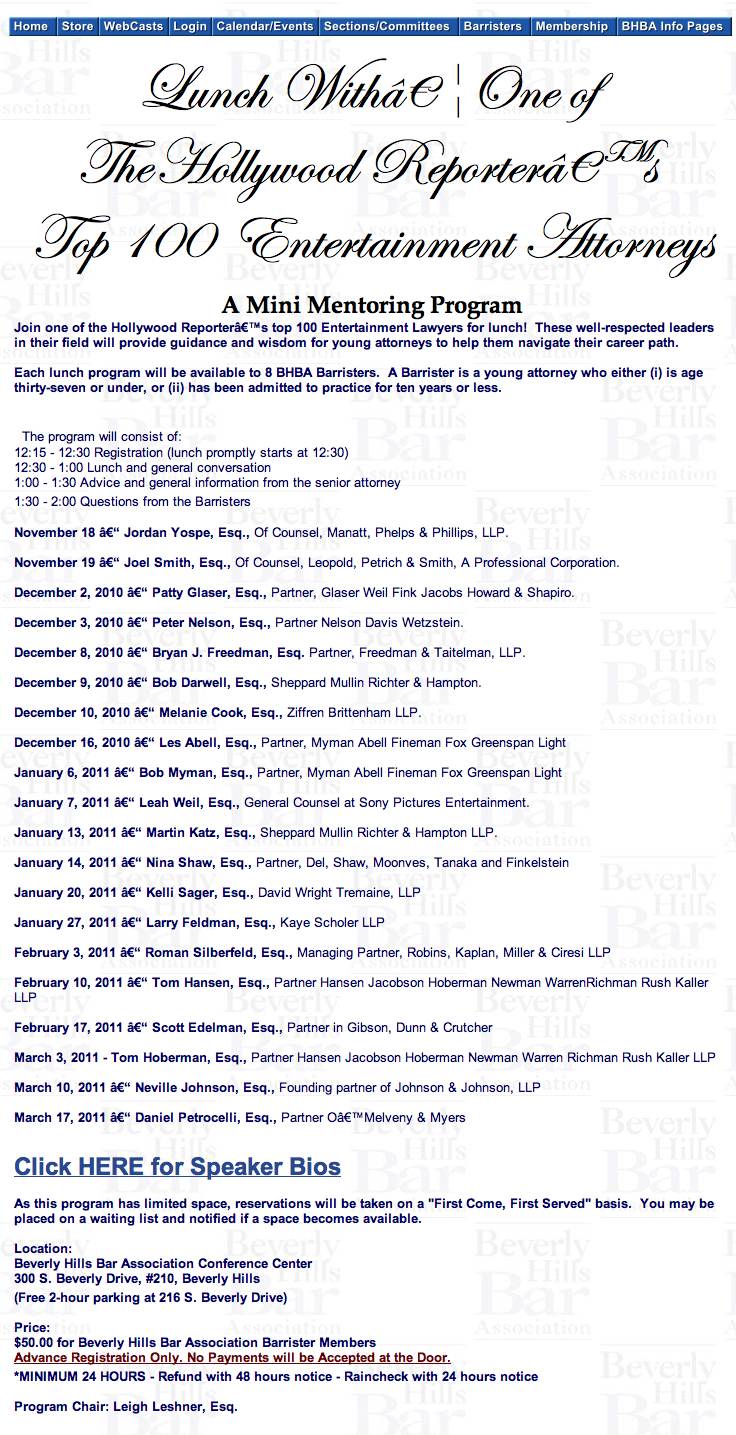 Join one of the Hollywood reporter’s top 100 entertainment lawyers for lunch! These well-respected leaders in their field will provide guidance and wisdom for young attornerys to help them navigate their career path.