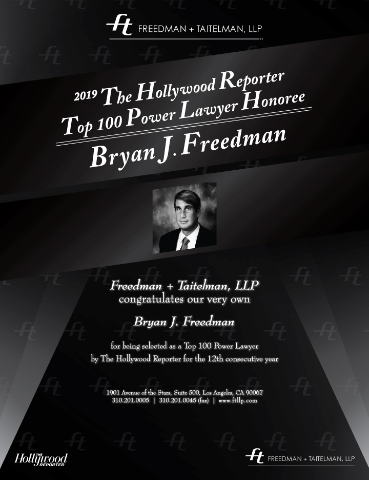 Freedman + Taitelman, LLP congratulates our very own Bryan J. Freedman for being selected as a Top 100 Power Lawyer by The Hollywood Reporter for the 12th consecutive year.