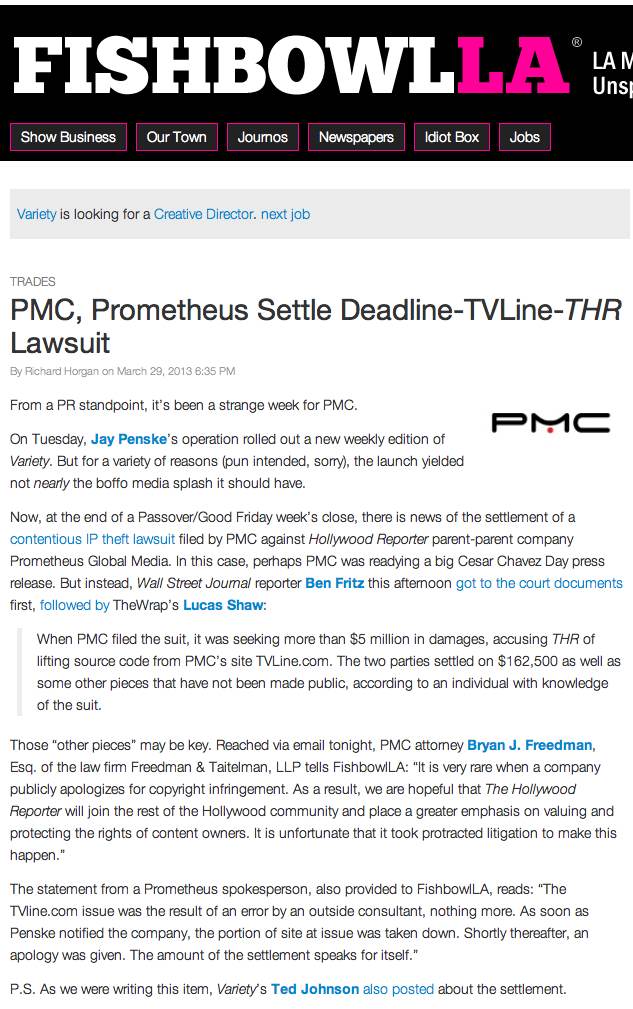 Now, at the end of a Passover/Good Friday week’s close, there is news of the settlement of a contentious IP theft lawsuit filed by PMC against Hollywood Reporter parent-parent company Prometheus Global Media. In this case, perhaps PMC was readying a big Cesar Chavez Day press release. But instead, Wall Street Journal reporter Ben Fritz this afternoon got to the court documents first, followed by TheWrap’s Lucas Shaw: