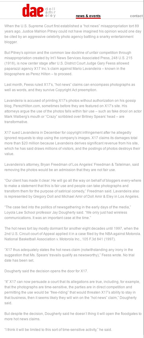 But Pitney’s opinion and the common law doctrine of unfair competition through misappropriation created by Int’l News Service v. Associated Press, 248 U.S. 215 (1918), is now center stage after U.S. District Court Judge Gary Feess allowed paparazzi agency X17 Inc.’s claim against Mario Lavandeira — known in the blogosphere as Perez Hilton — to proceed.