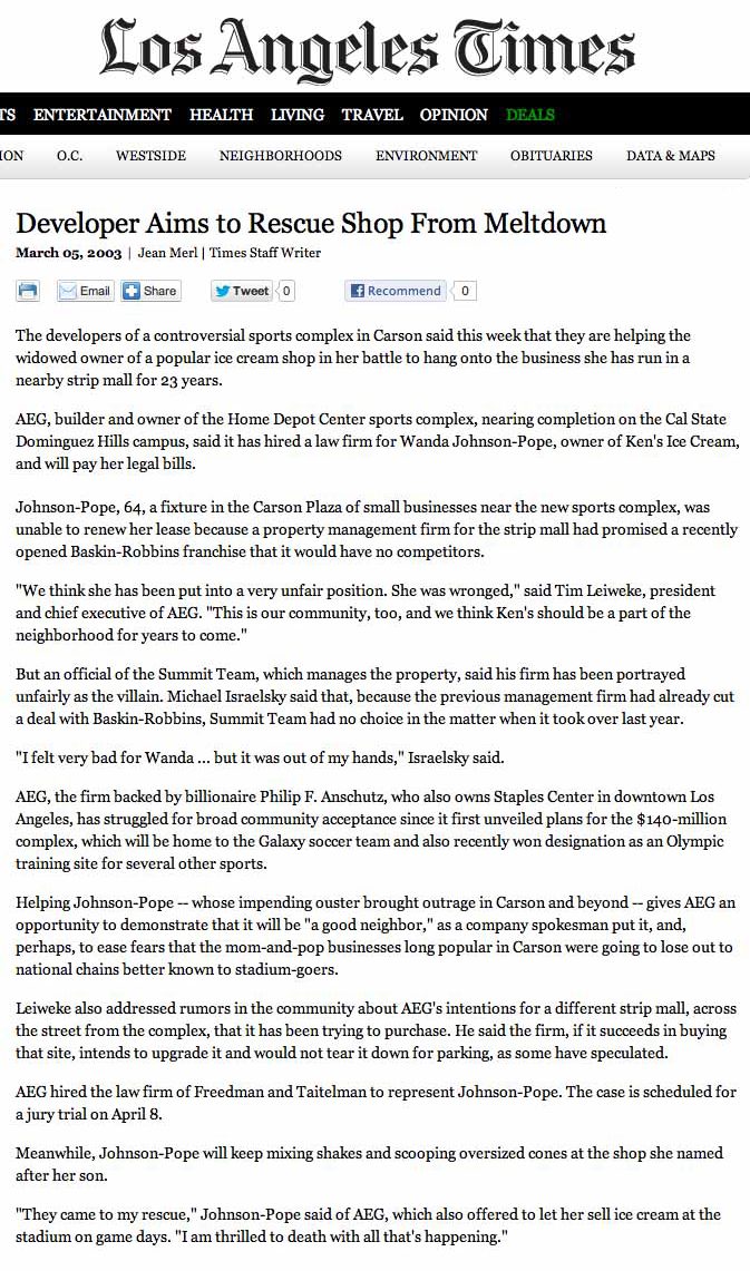 Johnson-Pope, 64, a fixture in the Carson Plaza of small businesses near the new sports complex, was unable to renew her lease because a property management firm for the strip mall had promised a recently opened Baskin-Robbins franchise that it would have no competitors.
