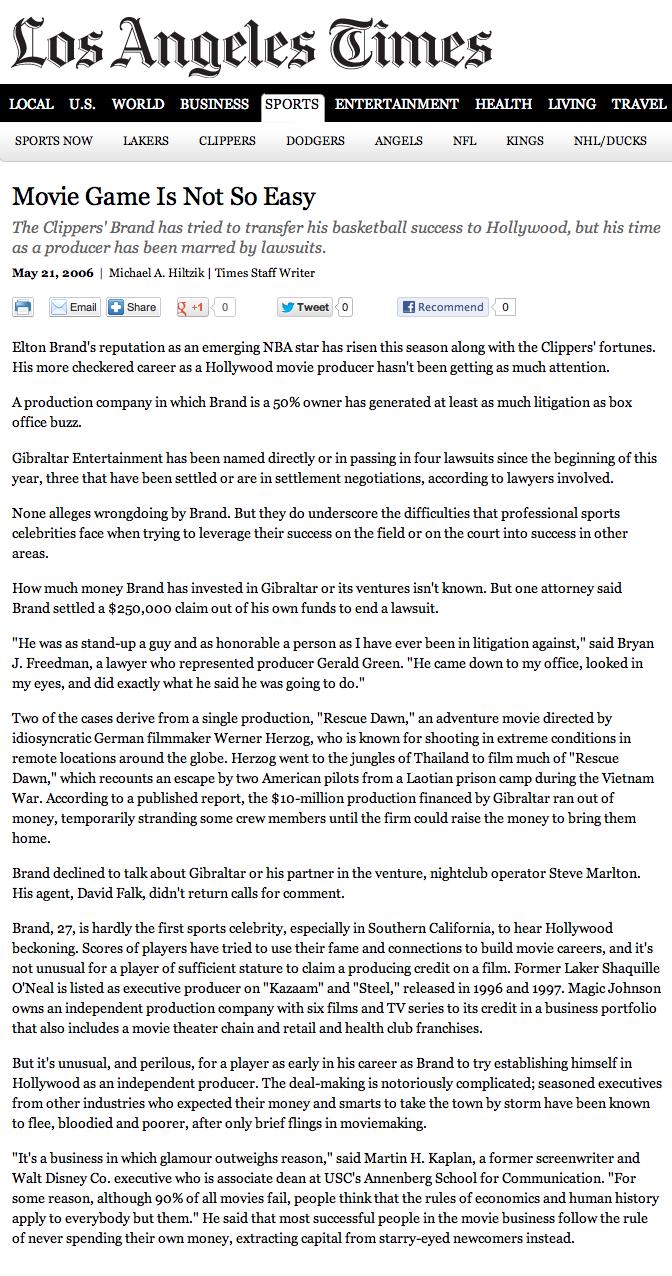 Brand, 27, is hardly the first sports celebrity, especially in Southern California, to hear Hollywood beckoning. Scores of players have tried to use their fame and connections to build movie careers, and it’s not unusual for a player of sufficient stature to claim a producing credit on a film. Former Laker Shaquille O’Neal is listed as executive producer on “Kazaam” and “Steel,” released in 1996 and 1997. Magic Johnson owns an independent production company with six films and TV series to its credit in a business portfolio that also includes a movie theater chain and retail and health club franchises.